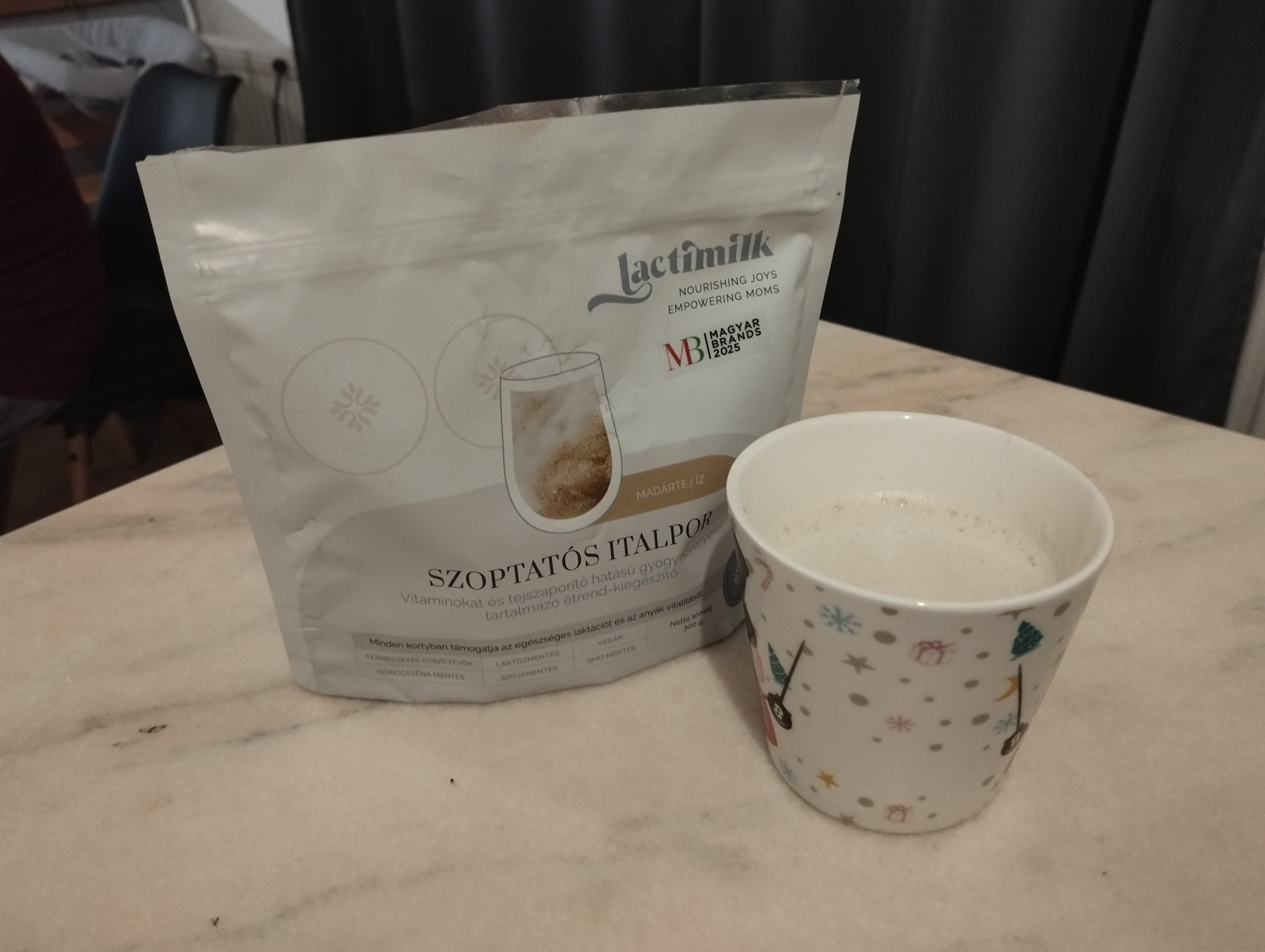 Egy hónapja iszom, van elegendő tejem, sőt még több is. Az íze is finom, jól esik leülni pár percre és meginni egy bögre meleg italt.